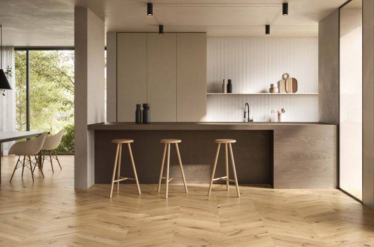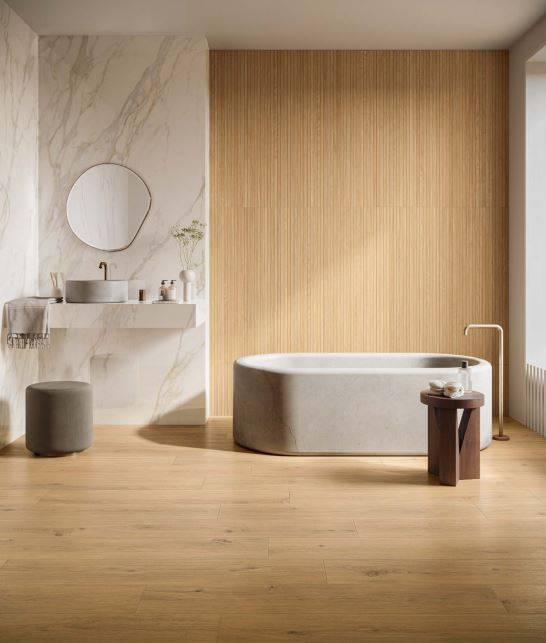 Ce carrelage imitation parquet chêne se marie parfaitement avec les carreaux Homey Canneté, pour un style affirmé et moderne.
