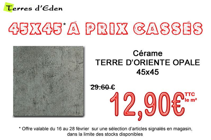 Du 16 au 28 FEVRIER 2015, Terres d'Eden, spécialiste du carrelage dans le Vaucluse, vous invite à découvrir une sélection de carrelages de sol intérieur en grés cérame ou grés émaillé au format 45X45 à PRIX CASSES.